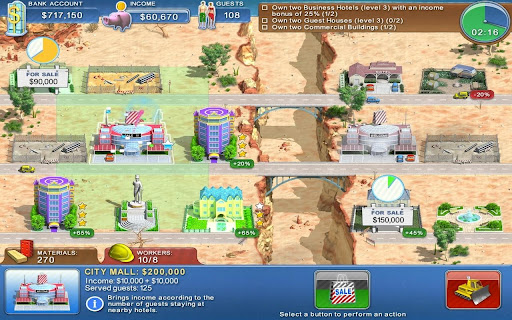 Compre, desarrolle y venda propiedades comerciales para obtener ganancias; construye atracciones que aumenten tus ingresos; y mantén tu ojo en la línea de fondo a medida que compras materiales y contratas trabajadores. ¡La diversión de apuntar y tocar del Hotel Mogul te hará reír todo el camino hasta el banco!